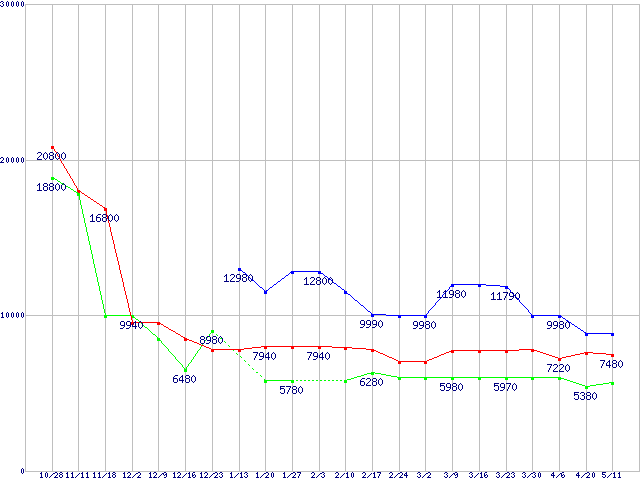 | メモリ主要製品(最安値5千円〜1万円未満)の最安値推移 |