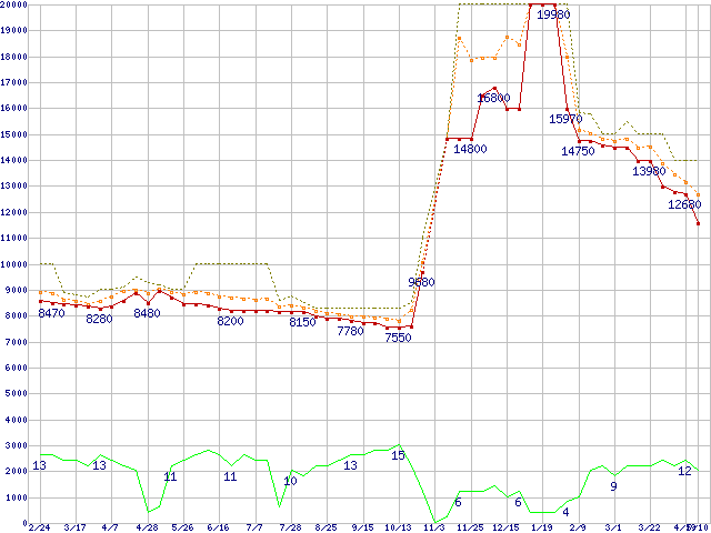 0S03191(純正パッケージ品) (2TB,64MB)の価格推移↑前グラフ↓次グラフ(2011年2月24日〜2012年5月10日)※このグラフは過去のデータも税率5%相当に調整した税込み相当額のグラフです。●関連グラフHDD/SSD主要製品の最安値推移HDD/SSD主要製品(最安値1万円〜1万5千円未満)の最安値推移HDD 2TB〜2.5TB未満の最安値推移DESKSTAR (6Gb/s)の最安値推移●凡例最安値(点線部は販売店未確認または未調査)平均値最高値ショップ数