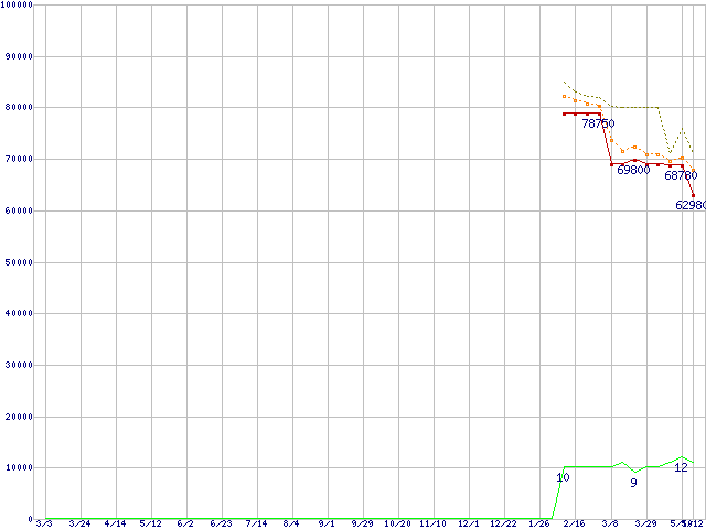 SSD 520 (480GB,MLC)の価格推移↑前グラフ↓次グラフ(2011年3月3日〜2012年5月12日)※このグラフは過去のデータも税率5%相当に調整した税込み相当額のグラフです。●関連グラフSSD 520 (SSD,6Gbps,2.5インチ,リード550MB/s・ライト520〜475MB/s)の最安値推移●凡例最安値(点線部は販売店未確認または未調査)平均値最高値ショップ数