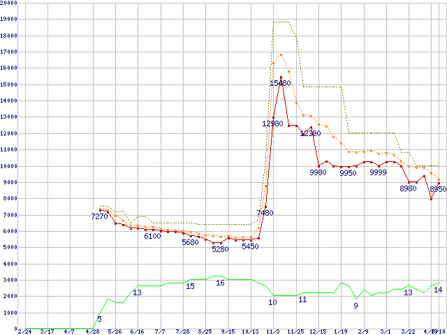 WD20EARX (2TB,64MB)の価格推移↑前グラフ↓次グラフ(2011年2月24日〜2012年5月10日)※このグラフは過去のデータも税率5%相当に調整した税込み相当額のグラフです。●関連グラフHDD/SSD主要製品の最安値推移HDD/SSD主要製品(最安値1万円未満)の最安値推移HDD 2TB〜2.5TB未満の最安値推移WD Caviar Green (6Gb/s)の最安値推移●凡例最安値(点線部は販売店未確認または未調査)平均値最高値ショップ数