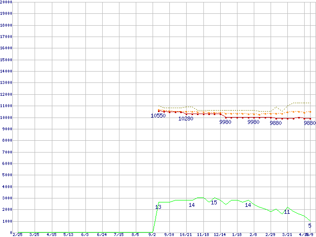 Core i3-2120T (2.60GHz,TDP 35W)の価格推移↑前グラフ↓次グラフ(2011年2月25日〜2012年5月9日)※このグラフは過去のデータも税率5%相当に調整した税込み相当額のグラフです。●関連グラフCPU主要製品の最安値推移CPU主要製品(最安値1万円未満)の最安値推移Intel系CPUの最安値推移LGA1155 (Smart Cache 3MB,Dual Core,GPU内蔵,Hyper-Threading)の最安値推移●凡例最安値(点線部は販売店未確認または未調査)平均値最高値ショップ数