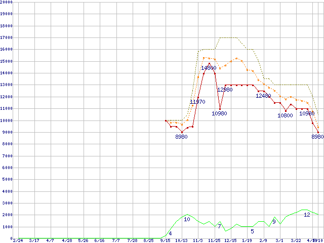 WD10JPVT (1TB,8MB)の価格推移↑前グラフ↓次グラフ(2011年2月24日〜2012年5月10日)※このグラフは過去のデータも税率5%相当に調整した税込み相当額のグラフです。●関連グラフHDD/SSD主要製品の最安値推移HDD/SSD主要製品(最安値1万円未満)の最安値推移HDD 1TB〜1.5TB未満の最安値推移WD Scorpio Blue (5200〜5400rpm,3Gb/s,2.5インチ)の最安値推移●凡例最安値(点線部は販売店未確認または未調査)平均値最高値ショップ数