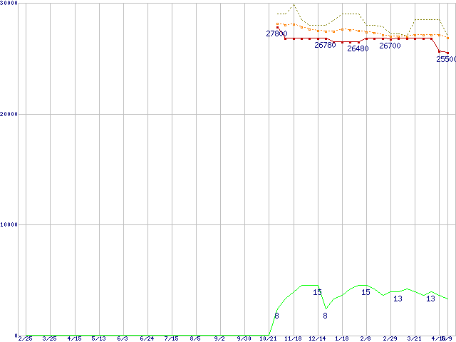 Core i7-2700K (3.50GHz,TDP 95W)の価格推移↑前グラフ↓次グラフ(2011年2月25日〜2012年5月9日)※このグラフは過去のデータも税率5%相当に調整した税込み相当額のグラフです。●関連グラフCPU主要製品の最安値推移CPU主要製品(最安値2万円〜3万円未満)の最安値推移Intel系CPUの最安値推移LGA1155 (Smart Cache 8MB,Quad Core,GPU内蔵,Hyper-Threading)の最安値推移●凡例最安値(点線部は販売店未確認または未調査)平均値最高値ショップ数