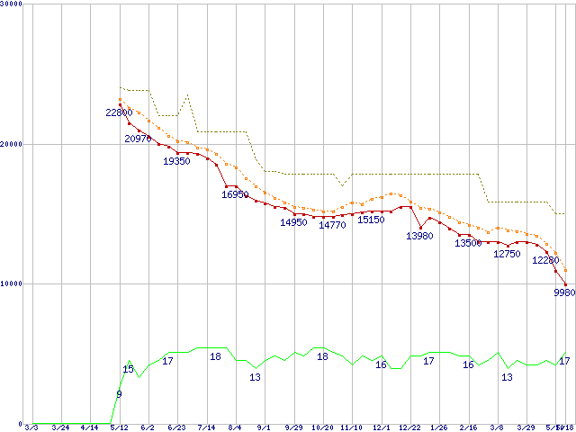 m4 (128GB,MLC)の価格推移↑前グラフ↓次グラフ(2011年3月3日〜2012年5月18日)※このグラフは過去のデータも税率5%相当に調整した税込み相当額のグラフです。●関連グラフm4 (SSD,6Gbps,2.5インチ,リード415MB/s・ライト260〜95MB/s)の最安値推移●凡例最安値(点線部は販売店未確認または未調査)平均値最高値ショップ数