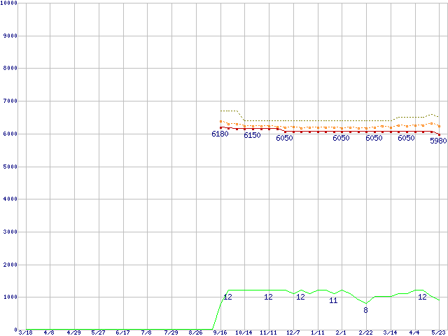 Pentium G630T (2.3GHz,TDP 35W)の価格推移↑前グラフ↓次グラフ(2011年3月18日〜2012年5月23日)※このグラフは過去のデータも税率5%相当に調整した税込み相当額のグラフです。●関連グラフCPU主要製品の最安値推移CPU主要製品(最安値1万円未満)の最安値推移Intel系CPUの最安値推移LGA1155 (Smart Cache 3MB,Dual Core,GPU内蔵)の最安値推移●凡例最安値(点線部は販売店未確認または未調査)平均値最高値ショップ数