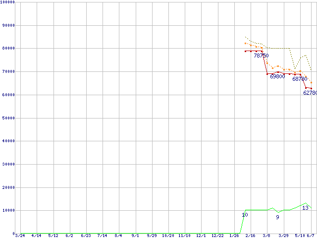 SSD 520 (480GB,MLC)の価格推移↑前グラフ↓次グラフ(2011年3月24日〜2012年6月7日)※このグラフは過去のデータも税率5%相当に調整した税込み相当額のグラフです。●関連グラフHDD/SSD主要製品の最安値推移HDD/SSD主要製品(最安値2万円以上)の最安値推移HDD 400〜500GB未満の最安値推移SSD 520 (SSD,6Gbps,2.5インチ,リード550MB/s・ライト520〜475MB/s)の最安値推移●凡例最安値(点線部は販売店未確認または未調査)平均値最高値ショップ数