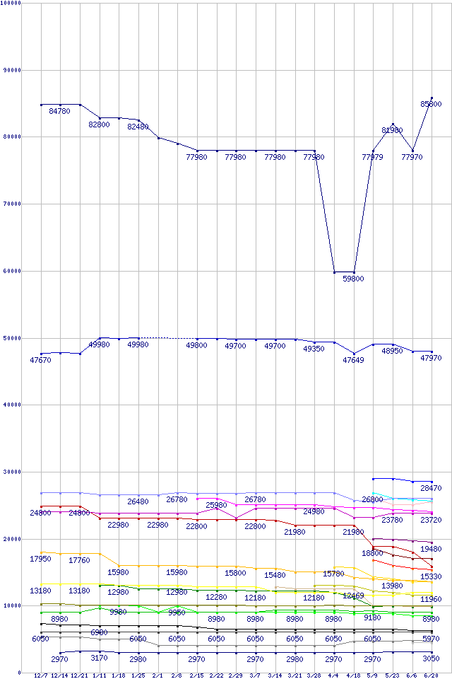 CPU主要製品の最安値推移↑前グラフ(2011年12月7日〜2012年6月20日)※このグラフは過去のデータも税率5%相当に調整した税込み相当額のグラフです。凡例Core i7-3960X Extreme Edition (3.30GHz,15MB)Core i7-3930K (3.20GHz,12MB)Core i7-3770K (3.50GHz,TDP 77W)Core i7-2700K (3.50GHz,TDP 95W)Core i7-3770S (3.10GHz,TDP 65W)Core i7-3770 (3.40GHz,TDP 77W)Core i7-3820 (3.60GHz,10MB)Core i7-2600K (3.40GHz,TDP 95W)Core i5-3570K (3.40GHz,TDP 77W)Core i5-3550 (3.30GHz,TDP 77W)FX-8150 (3.6GHz,L2 8MB,L3 8MB,TDP 125W)Core i5-3450S (2.80GHz,TDP 65W)Core i5-3450 (3.10GHz,TDP 77W)FX-8120 (3.1GHz,L2 8MB,L3 8MB,TDP 125W)FX-6200 (3.8GHz,L2 6MB,L3 8MB,TDP 125W)FX-6100 (3.3GHz,L2 6MB,L3 8MB,TDP 95W)FX-4170 (4.2GHz,L2 4MB,L3 8MB,TDP 125W)Core i3-2120T (2.60GHz,TDP 35W)A8-3820 (2.5GHz,TDP 65W)A8-3870K (3.0GHz,TDP 100W)FX-4100 (3.6GHz,L2 4MB,L3 8MB,TDP 95W)A6-3670K (2.7GHz,TDP 100W)A6-3500 (2.1GHz,TDP 65W)Pentium G630T (2.3GHz,TDP 35W)A4-3400 (2.7GHz,TDP 65W)Celeron G550 (2.6GHz,2MB,TDP 65W)Celeron G460 (1.8GHz,1.5MB,TDP 35W)※製品名をクリックすると個別のグラフを表示します※点線部は販売店が確認できなかった、または調査データがないことを示します