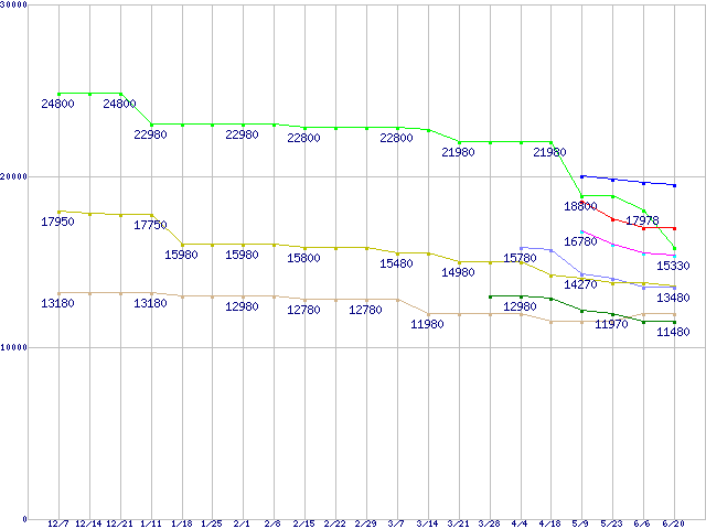 CPU主要製品(最安値1万円〜2万円未満)の最安値推移↑前グラフ↓次グラフ(2011年12月7日〜2012年6月20日)※このグラフは過去のデータも税率5%相当に調整した税込み相当額のグラフです。凡例Core i5-3570K (3.40GHz,TDP 77W)Core i5-3550 (3.30GHz,TDP 77W)FX-8150 (3.6GHz,L2 8MB,L3 8MB,TDP 125W)Core i5-3450S (2.80GHz,TDP 65W)Core i5-3450 (3.10GHz,TDP 77W)FX-8120 (3.1GHz,L2 8MB,L3 8MB,TDP 125W)FX-6200 (3.8GHz,L2 6MB,L3 8MB,TDP 125W)FX-6100 (3.3GHz,L2 6MB,L3 8MB,TDP 95W)FX-4170 (4.2GHz,L2 4MB,L3 8MB,TDP 125W)※製品名をクリックすると個別のグラフを表示します※点線部は販売店が確認できなかった、または調査データがないことを示します