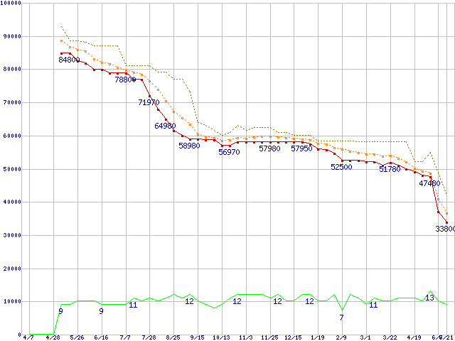 m4 (512GB,MLC)の価格推移↑前グラフ↓次グラフ(2011年4月7日〜2012年6月21日)※このグラフは過去のデータも税率5%相当に調整した税込み相当額のグラフです。●関連グラフHDD/SSD主要製品の最安値推移HDD/SSD主要製品(最安値2万円以上)の最安値推移HDD 500〜600GB未満の最安値推移m4 (SSD,6Gbps,2.5インチ,リード415MB/s・ライト260〜95MB/s)の最安値推移●凡例最安値(点線部は販売店未確認または未調査)平均値最高値ショップ数