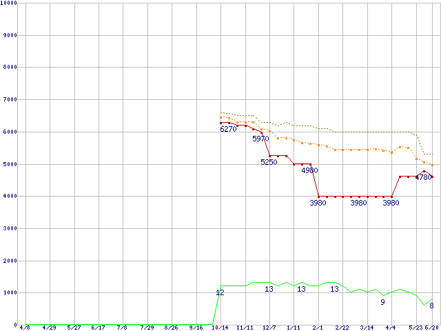 A4-3400 (2.7GHz,TDP 65W)の価格推移↑前グラフ↓次グラフ(2011年4月8日〜2012年6月20日)※このグラフは過去のデータも税率5%相当に調整した税込み相当額のグラフです。●関連グラフCPU主要製品の最安値推移CPU主要製品(最安値1万円未満)の最安値推移AMD系CPUの最安値推移Socket FM1 (Cache 1MB,2Core,Radeon HD 6410D)の最安値推移●凡例最安値(点線部は販売店未確認または未調査)平均値最高値ショップ数