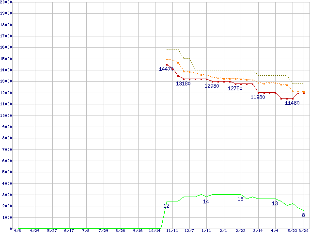 FX-6100 (3.3GHz,L2 6MB,L3 8MB,TDP 95W)の価格推移↑前グラフ↓次グラフ(2011年4月8日〜2012年6月20日)※このグラフは過去のデータも税率5%相当に調整した税込み相当額のグラフです。●関連グラフCPU主要製品の最安値推移CPU主要製品(最安値1万円〜2万円未満)の最安値推移AMD系CPUの最安値推移Socket AM3+ (HyperTransport,6Core)の最安値推移●凡例最安値(点線部は販売店未確認または未調査)平均値最高値ショップ数