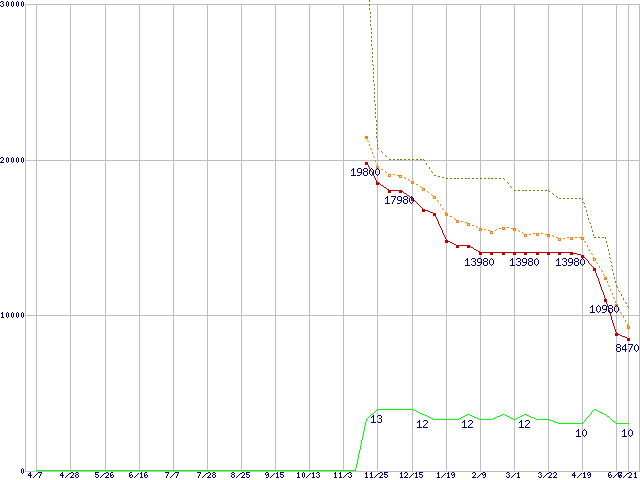 MZ-7PC128 (128GB,MLC)の価格推移↑前グラフ↓次グラフ(2011年4月7日〜2012年6月21日)※このグラフは過去のデータも税率5%相当に調整した税込み相当額のグラフです。●関連グラフHDD/SSD主要製品の最安値推移HDD/SSD主要製品(最安値1万円未満)の最安値推移HDD 100〜160GB未満の最安値推移SSD 830 (SSD,6Gb/s,2.5インチ,リード520MB/s・ライト400〜160MB/s,7mm厚)の最安値推移●凡例最安値(点線部は販売店未確認または未調査)平均値最高値ショップ数