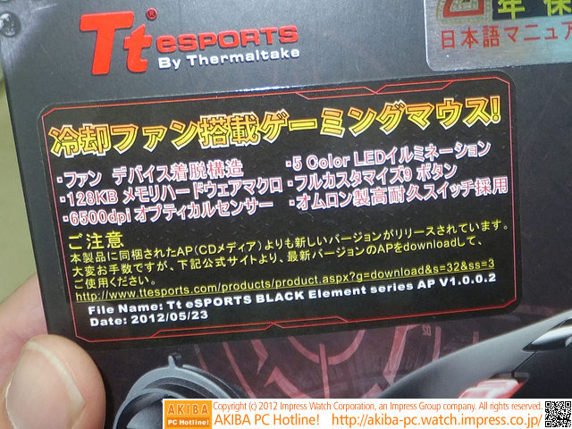 ![]() | AKIBA PC Hotline! [拡大画像]ゲームの熱を風で冷却、ファンを合体できるマウスが登場 今週見つけた新製品:入力デバイス Thermaltake Black Element Cyclone Edition(MO-BLE001DTF) |