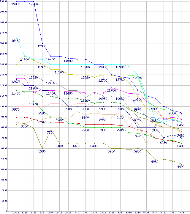 HDD/SSD主要製品(最安値1万円未満)の最安値推移↑前グラフ↓次グラフ(2012年1月12日〜2012年7月19日)※このグラフは過去のデータも税率5%相当に調整した税込み相当額のグラフです。凡例0S03191(純正パッケージ品) (2TB,64MB)PX-128M5S (128GB,MLC)SSD 330 (120GB,MLC)0S03224(純正パッケージ品) (2TB,32MB)MZ-7PC128 (128GB,MLC)m4 (128GB,MLC)0S03509 (1TB,8MB)HN-M101MBB (1TB,8MB)ST2000DM001 (2TB,64MB)WD20EARX (2TB,64MB)WD10JPVT (1TB,8MB)MQ01ABD100 (1TB,8MB)その他6Gbps対応SSD (120〜128GB,MLC)ST1000DM003 (1TB,64MB)WD10EZRX (1TB,64MB)その他6Gbps対応SSD (60〜64GB,MLC)※製品名をクリックすると個別のグラフを表示します※点線部は販売店が確認できなかった、または調査データがないことを示します