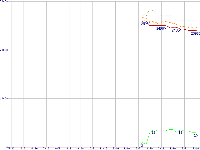 Core i7-3820 (3.60GHz,10MB)の価格推移↑前グラフ↓次グラフ(2011年5月13日〜2012年7月18日)※このグラフは過去のデータも税率5%相当に調整した税込み相当額のグラフです。●関連グラフCPU主要製品の最安値推移CPU主要製品(最安値2万円〜3万円未満)の最安値推移Intel系CPUの最安値推移LGA2011 (Hyper-Threading,TDP 130W)の最安値推移●凡例最安値(点線部は販売店未確認または未調査)平均値最高値ショップ数