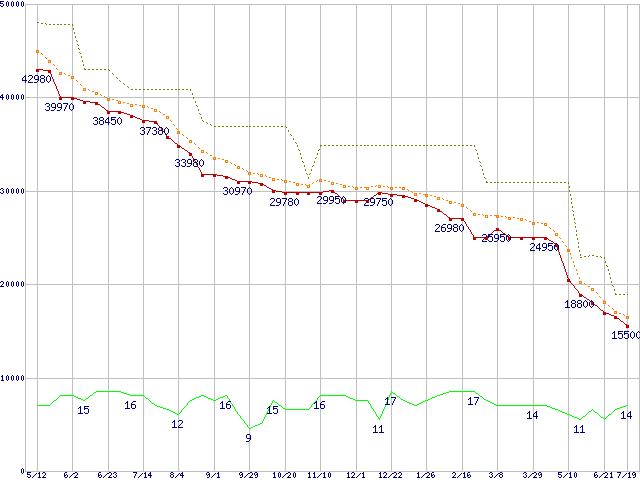 m4 (256GB,MLC)の価格推移↑前グラフ↓次グラフ(2011年5月12日〜2012年7月19日)※このグラフは過去のデータも税率5%相当に調整した税込み相当額のグラフです。●関連グラフHDD/SSD主要製品の最安値推移HDD/SSD主要製品(最安値1万5千円〜2万円未満)の最安値推移HDD 250〜300GB未満の最安値推移m4 (SSD,6Gbps,2.5インチ,リード415MB/s・ライト260〜95MB/s)の最安値推移●凡例最安値(点線部は販売店未確認または未調査)平均値最高値ショップ数
