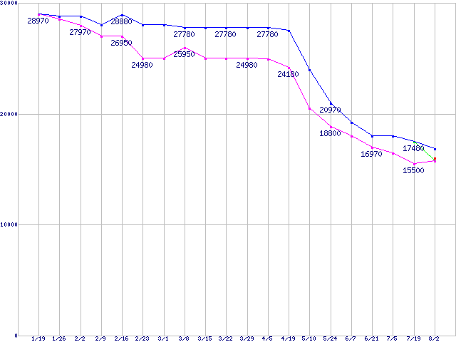| HDD/SSD主要製品(最安値1万5千円〜2万円未満)の最安値推移 |