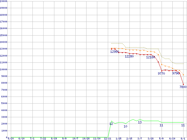 A8-3870K (3.0GHz,TDP 100W)の価格推移↑前グラフ↓次グラフ(2011年5月20日〜2012年8月1日)※このグラフは過去のデータも税率5%相当に調整した税込み相当額のグラフです。●関連グラフCPU主要製品の最安値推移CPU主要製品(最安値1万円未満)の最安値推移AMD系CPUの最安値推移Socket FM1 (Cache 4MB,4Core,Radeon HD 6550D)の最安値推移●凡例最安値(点線部は販売店未確認または未調査)平均値最高値ショップ数