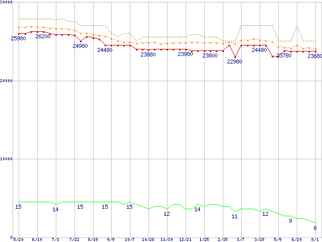 Core i7-2600K (3.40GHz,TDP 95W)の価格推移↑前グラフ↓次グラフ(2011年5月20日〜2012年8月1日)※このグラフは過去のデータも税率5%相当に調整した税込み相当額のグラフです。●関連グラフCPU主要製品の最安値推移CPU主要製品(最安値2万円〜3万円未満)の最安値推移Intel系CPUの最安値推移LGA1155 (Smart Cache 8MB,Quad Core,GPU内蔵,Hyper-Threading)の最安値推移●凡例最安値(点線部は販売店未確認または未調査)平均値最高値ショップ数