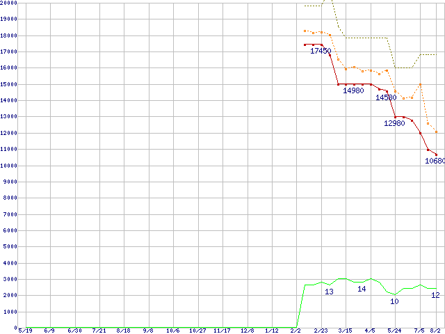 SSD 520 (120GB,MLC)の価格推移↑前グラフ↓次グラフ(2011年5月19日〜2012年8月2日)※このグラフは過去のデータも税率5%相当に調整した税込み相当額のグラフです。●関連グラフHDD/SSD主要製品の最安値推移HDD/SSD主要製品(最安値1万円〜1万5千円未満)の最安値推移HDD 100〜160GB未満の最安値推移SSD 520 (SSD,6Gbps,2.5インチ,リード550MB/s・ライト520〜475MB/s)の最安値推移●凡例最安値(点線部は販売店未確認または未調査)平均値最高値ショップ数