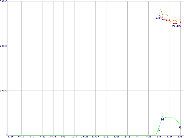 Core i7-3770S (3.10GHz,TDP 65W)の価格推移↑前グラフ↓次グラフ(2011年5月20日〜2012年8月1日)※このグラフは過去のデータも税率5%相当に調整した税込み相当額のグラフです。●関連グラフCPU主要製品の最安値推移CPU主要製品(最安値2万円〜3万円未満)の最安値推移Intel系CPUの最安値推移LGA1155 (Smart Cache 8MB,Quad Core,GPU内蔵,Hyper-Threading)の最安値推移●凡例最安値(点線部は販売店未確認または未調査)平均値最高値ショップ数