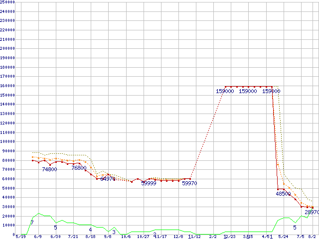 その他6Gbps対応SSD (480〜512GB,MLC)の価格推移↑前グラフ↓次グラフ(2011年5月19日〜2012年8月2日)※このグラフは過去のデータも税率5%相当に調整した税込み相当額のグラフです。●関連グラフHDD/SSD主要製品の最安値推移HDD/SSD主要製品(最安値2万円以上)の最安値推移HDD 500〜600GB未満の最安値推移2.5インチSSD (SSD,6Gbps,2.5インチ)の最安値推移SSD 480〜512GBの最安値推移●凡例最安値(点線部は販売店未確認または未調査)平均値最高値ショップ数