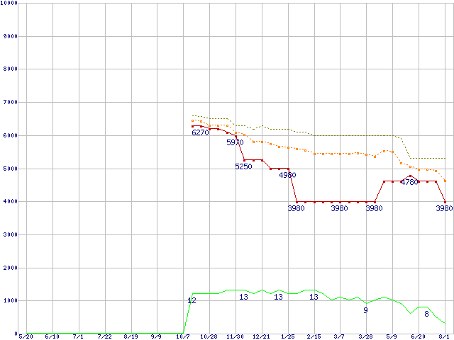 A4-3400 (2.7GHz,TDP 65W)の価格推移↑前グラフ↓次グラフ(2011年5月20日〜2012年8月1日)※このグラフは過去のデータも税率5%相当に調整した税込み相当額のグラフです。●関連グラフCPU主要製品の最安値推移CPU主要製品(最安値1万円未満)の最安値推移AMD系CPUの最安値推移Socket FM1 (Cache 1MB,2Core,Radeon HD 6410D)の最安値推移●凡例最安値(点線部は販売店未確認または未調査)平均値最高値ショップ数