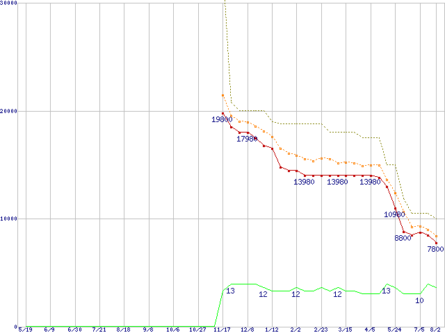 MZ-7PC128 (128GB,MLC)の価格推移↑前グラフ(2011年5月19日〜2012年8月2日)※このグラフは過去のデータも税率5%相当に調整した税込み相当額のグラフです。●関連グラフHDD/SSD主要製品の最安値推移HDD/SSD主要製品(最安値1万円未満)の最安値推移HDD 100〜160GB未満の最安値推移SSD 830 (SSD,6Gb/s,2.5インチ,リード520MB/s・ライト400〜160MB/s,7mm厚)の最安値推移●凡例最安値(点線部は販売店未確認または未調査)平均値最高値ショップ数