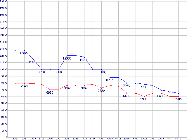 | メモリ主要製品(最安値5千円〜1万円未満)の最安値推移 |