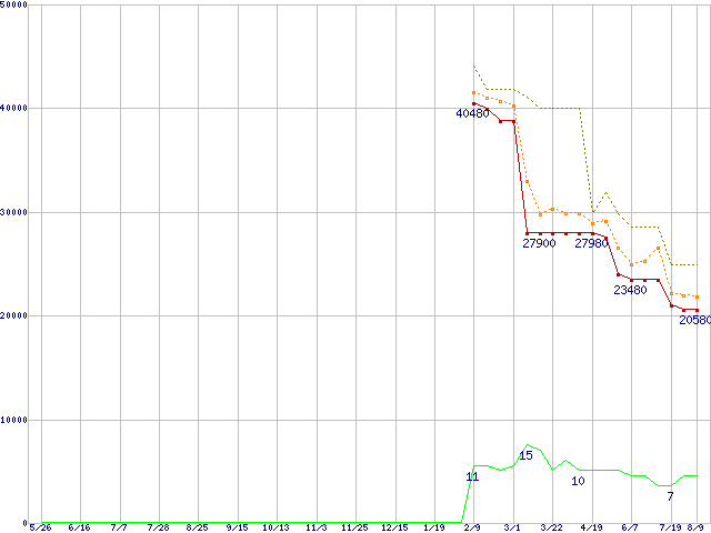 SSD 520 (240GB,MLC)の価格推移↑前グラフ↓次グラフ(2011年5月26日〜2012年8月9日)※このグラフは過去のデータも税率5%相当に調整した税込み相当額のグラフです。●関連グラフHDD/SSD主要製品の最安値推移HDD/SSD主要製品(最安値2万円以上)の最安値推移HDD 200〜250GB未満の最安値推移SSD 520 (SSD,6Gbps,2.5インチ,リード550MB/s・ライト520〜475MB/s)の最安値推移●凡例最安値(点線部は販売店未確認または未調査)平均値最高値ショップ数