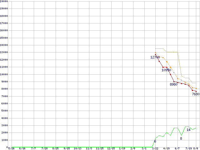 0S03509 (1TB,8MB)の価格推移↑前グラフ↓次グラフ(2011年5月26日〜2012年8月9日)※このグラフは過去のデータも税率5%相当に調整した税込み相当額のグラフです。●関連グラフHDD/SSD主要製品の最安値推移HDD/SSD主要製品(最安値1万円未満)の最安値推移HDD 1TB〜1.5TB未満の最安値推移TRAVELSTAR (5400rpm,3Gb/s,2.5インチ)の最安値推移●凡例最安値(点線部は販売店未確認または未調査)平均値最高値ショップ数