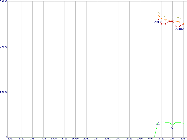 Core i7-3770 (3.40GHz,TDP 77W)の価格推移↓次グラフ(2011年5月27日〜2012年8月8日)※このグラフは過去のデータも税率5%相当に調整した税込み相当額のグラフです。●関連グラフCPU主要製品の最安値推移CPU主要製品(最安値2万円〜3万円未満)の最安値推移Intel系CPUの最安値推移LGA1155 (Smart Cache 8MB,Quad Core,GPU内蔵,Hyper-Threading)の最安値推移●凡例最安値(点線部は販売店未確認または未調査)平均値最高値ショップ数
