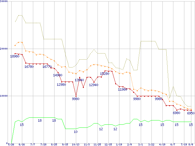 その他6Gbps対応SSD (120〜128GB,MLC)の価格推移↑前グラフ↓次グラフ(2011年5月26日〜2012年8月9日)※このグラフは過去のデータも税率5%相当に調整した税込み相当額のグラフです。●関連グラフHDD/SSD主要製品の最安値推移HDD/SSD主要製品(最安値1万円未満)の最安値推移HDD 100〜160GB未満の最安値推移2.5インチSSD (SSD,6Gbps,2.5インチ)の最安値推移●凡例最安値(点線部は販売店未確認または未調査)平均値最高値ショップ数
