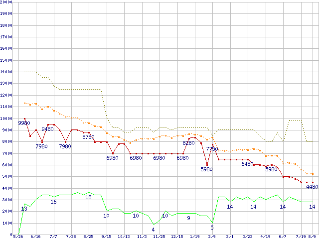 その他6Gbps対応SSD (60〜64GB,MLC)の価格推移↑前グラフ↓次グラフ(2011年5月26日〜2012年8月9日)※このグラフは過去のデータも税率5%相当に調整した税込み相当額のグラフです。●関連グラフHDD/SSD主要製品の最安値推移HDD/SSD主要製品(最安値1万円未満)の最安値推移HDD/SSD 60GB〜80GB未満の最安値推移2.5インチSSD (SSD,6Gbps,2.5インチ)の最安値推移●凡例最安値(点線部は販売店未確認または未調査)平均値最高値ショップ数