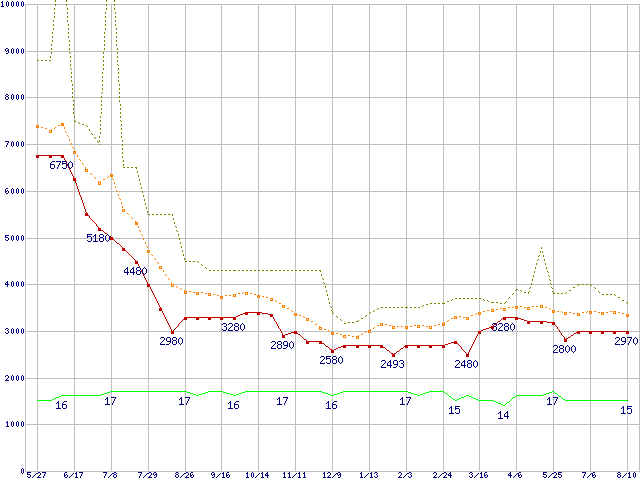 PC3-12800 4GB×2枚組みセットの価格推移↑前グラフ↓次グラフ(2011年5月27日〜2012年8月10日)※このグラフは過去のデータも税率5%相当に調整した税込み相当額のグラフです。●関連グラフメモリ主要製品の最安値推移メモリ主要製品(最安値5千円未満)の最安値推移PC3-12800(DDR3-1600) DDR3 SDRAM DIMMの最安値推移●凡例最安値(点線部は販売店未確認または未調査)平均値最高値ショップ数