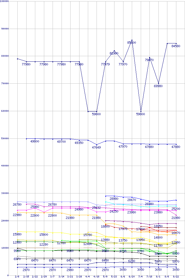 CPU主要製品の最安値推移↑前グラフ(2012年2月8日〜2012年8月22日)※このグラフは過去のデータも税率5%相当に調整した税込み相当額のグラフです。凡例Core i7-3960X Extreme Edition (3.30GHz,15MB)Core i7-3930K (3.20GHz,12MB)Core i7-3770K (3.50GHz,TDP 77W)Core i7-2700K (3.50GHz,TDP 95W)Core i7-3770S (3.10GHz,TDP 65W)Core i7-3770 (3.40GHz,TDP 77W)Core i7-2600K (3.40GHz,TDP 95W)Core i7-3820 (3.60GHz,10MB)Core i5-3570K (3.40GHz,TDP 77W)Core i5-3570 (3.40GHz,TDP 77W)Core i5-3550 (3.30GHz,TDP 77W)Core i5-3470S (2.90GHz,TDP 65W)Core i5-3470 (3.20GHz,TDP 77W)FX-8150 (3.6GHz,L2 8MB,L3 8MB,TDP 125W)FX-6200 (3.8GHz,L2 6MB,L3 8MB,TDP 125W)FX-8120 (3.1GHz,L2 8MB,L3 8MB,TDP 125W)FX-6100 (3.3GHz,L2 6MB,L3 8MB,TDP 95W)FX-4170 (4.2GHz,L2 4MB,L3 8MB,TDP 125W)Core i3-2120T (2.60GHz,TDP 35W)A8-3870K (3.0GHz,TDP 100W)FX-4100 (3.6GHz,L2 4MB,L3 8MB,TDP 95W)A8-3820 (2.5GHz,TDP 65W)A6-3670K (2.7GHz,TDP 100W)Pentium G630T (2.3GHz,TDP 35W)A6-3500 (2.1GHz,TDP 65W)Celeron G550 (2.6GHz,2MB,TDP 65W)A4-3400 (2.7GHz,TDP 65W)Celeron G460 (1.8GHz,1.5MB,TDP 35W)※製品名をクリックすると個別のグラフを表示します※点線部は販売店が確認できなかった、または調査データがないことを示します