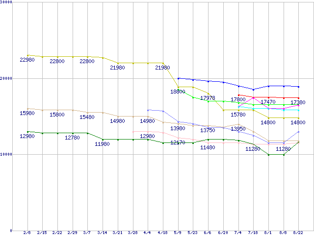 CPU主要製品(最安値1万円〜2万円未満)の最安値推移↑前グラフ↓次グラフ(2012年2月8日〜2012年8月22日)※このグラフは過去のデータも税率5%相当に調整した税込み相当額のグラフです。凡例Core i5-3570K (3.40GHz,TDP 77W)Core i5-3570 (3.40GHz,TDP 77W)Core i5-3550 (3.30GHz,TDP 77W)Core i5-3470S (2.90GHz,TDP 65W)Core i5-3470 (3.20GHz,TDP 77W)FX-8150 (3.6GHz,L2 8MB,L3 8MB,TDP 125W)FX-6200 (3.8GHz,L2 6MB,L3 8MB,TDP 125W)FX-8120 (3.1GHz,L2 8MB,L3 8MB,TDP 125W)FX-6100 (3.3GHz,L2 6MB,L3 8MB,TDP 95W)FX-4170 (4.2GHz,L2 4MB,L3 8MB,TDP 125W)※製品名をクリックすると個別のグラフを表示します※点線部は販売店が確認できなかった、または調査データがないことを示します