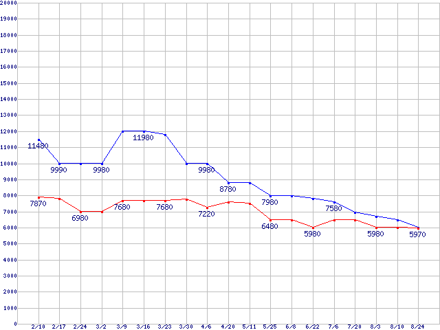 | メモリ主要製品(最安値5千円〜1万円未満)の最安値推移 |