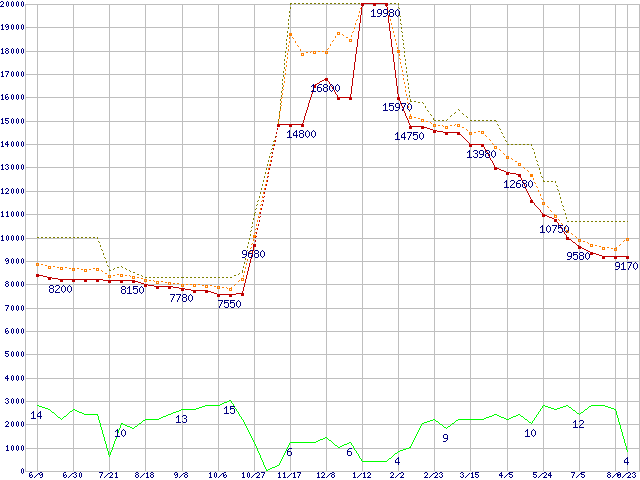 0S03191(純正パッケージ品) (2TB,64MB)の価格推移↑前グラフ↓次グラフ(2011年6月9日〜2012年8月23日)※このグラフは過去のデータも税率5%相当に調整した税込み相当額のグラフです。●関連グラフHDD/SSD主要製品の最安値推移HDD/SSD主要製品(最安値1万円未満)の最安値推移HDD 2TB〜2.5TB未満の最安値推移DESKSTAR (6Gb/s)の最安値推移●凡例最安値(点線部は販売店未確認または未調査)平均値最高値ショップ数