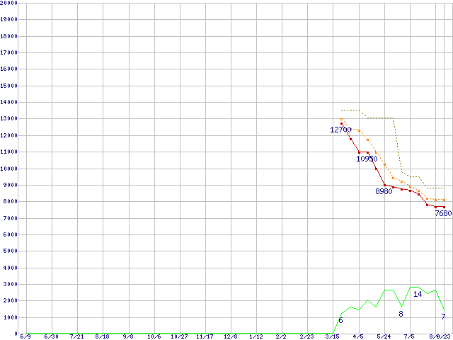 0S03509 (1TB,8MB)の価格推移↑前グラフ↓次グラフ(2011年6月9日〜2012年8月23日)※このグラフは過去のデータも税率5%相当に調整した税込み相当額のグラフです。●関連グラフHDD/SSD主要製品の最安値推移HDD/SSD主要製品(最安値1万円未満)の最安値推移HDD 1TB〜1.5TB未満の最安値推移TRAVELSTAR (5400rpm,3Gb/s,2.5インチ)の最安値推移●凡例最安値(点線部は販売店未確認または未調査)平均値最高値ショップ数