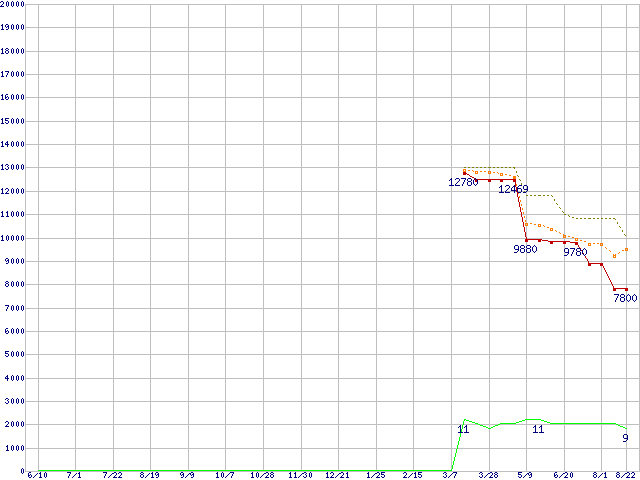 A8-3820 (2.5GHz,TDP 65W)の価格推移↑前グラフ↓次グラフ(2011年6月10日〜2012年8月22日)※このグラフは過去のデータも税率5%相当に調整した税込み相当額のグラフです。●関連グラフCPU主要製品の最安値推移CPU主要製品(最安値1万円未満)の最安値推移AMD系CPUの最安値推移Socket FM1 (Cache 4MB,4Core,Radeon HD 6550D)の最安値推移●凡例最安値(点線部は販売店未確認または未調査)平均値最高値ショップ数