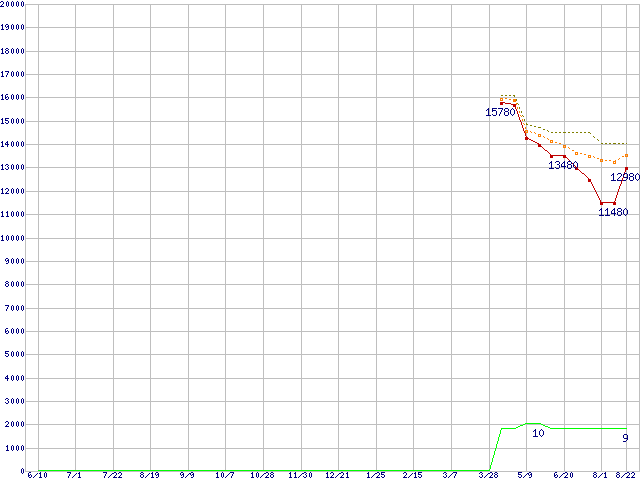 FX-6200 (3.8GHz,L2 6MB,L3 8MB,TDP 125W)の価格推移↑前グラフ↓次グラフ(2011年6月10日〜2012年8月22日)※このグラフは過去のデータも税率5%相当に調整した税込み相当額のグラフです。●関連グラフCPU主要製品の最安値推移CPU主要製品(最安値1万円〜2万円未満)の最安値推移AMD系CPUの最安値推移Socket AM3+ (HyperTransport,6Core)の最安値推移●凡例最安値(点線部は販売店未確認または未調査)平均値最高値ショップ数