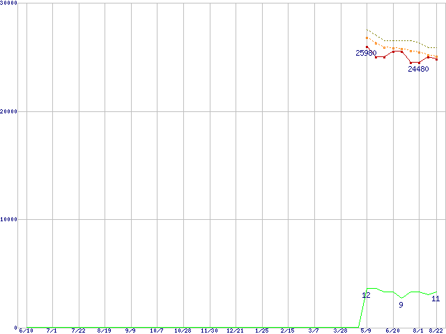 Core i7-3770 (3.40GHz,TDP 77W)の価格推移↓次グラフ(2011年6月10日〜2012年8月22日)※このグラフは過去のデータも税率5%相当に調整した税込み相当額のグラフです。●関連グラフCPU主要製品の最安値推移CPU主要製品(最安値2万円〜3万円未満)の最安値推移Intel系CPUの最安値推移LGA1155 (Smart Cache 8MB,Quad Core,GPU内蔵,Hyper-Threading)の最安値推移●凡例最安値(点線部は販売店未確認または未調査)平均値最高値ショップ数