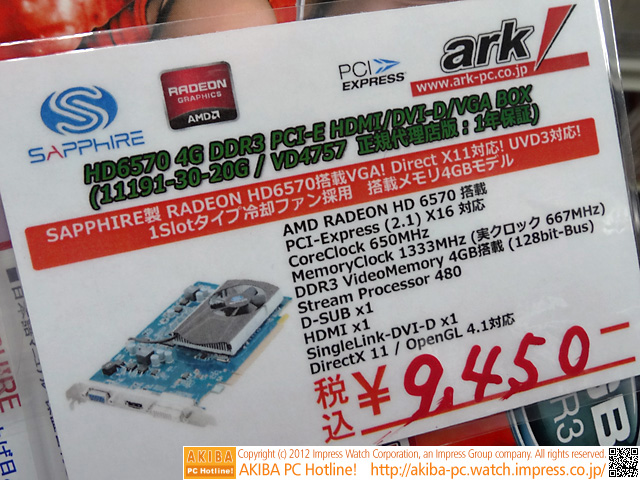 AKIBA PC Hotline!今週見つけた新製品:ビデオカード [拡大画像]SAPPHIRE HD6570 4G DDR3 PCI-E HDMI/DVI-D/VGA(11191-30-20G)[記事に戻る]→次の画像
