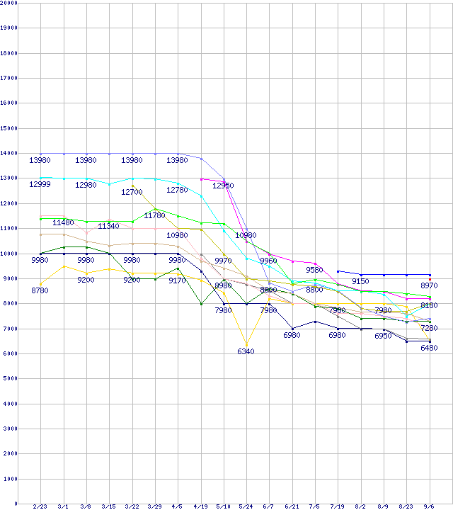 HDD/SSD主要製品(最安値1万円未満)の最安値推移↑前グラフ↓次グラフ(2012年2月23日〜2012年9月6日)※このグラフは過去のデータも税率5%相当に調整した税込み相当額のグラフです。凡例PX-128M5S (128GB,MLC)DT01ACA200 (2TB,64MB)0S03224(純正パッケージ品) (2TB,32MB)SSD 330 (120GB,MLC)m4 (128GB,MLC)0S03509 (1TB,8MB)MZ-7PC128 (128GB,MLC)ST2000DM001 (2TB,64MB)WD20EARX (2TB,64MB)WD10JPVT (1TB,8MB)MQ01ABD100 (1TB,8MB)HN-M101MBB (1TB,8MB)その他6Gbps対応SSD (120〜128GB,MLC)※製品名をクリックすると個別のグラフを表示します※点線部は販売店が確認できなかった、または調査データがないことを示します