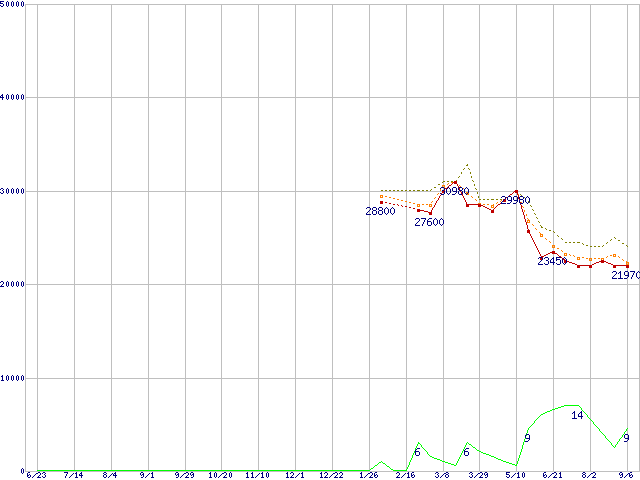 0S03357(純正パッケージ品) (4TB,64MB)の価格推移↓次グラフ(2011年6月23日〜2012年9月6日)※このグラフは過去のデータも税率5%相当に調整した税込み相当額のグラフです。●関連グラフHDD/SSD主要製品の最安値推移HDD/SSD主要製品(最安値2万円以上)の最安値推移HDD 4TB以上の最安値推移DESKSTAR (6Gb/s)の最安値推移●凡例最安値(点線部は販売店未確認または未調査)平均値最高値ショップ数