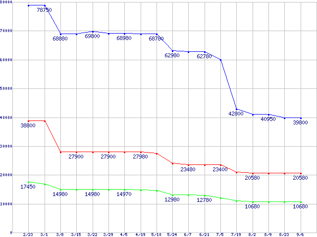 | SSD 520 (SSD,6Gbps,2.5インチ,リード550MB/s・ライト520〜475MB/s)の最安値推移 |