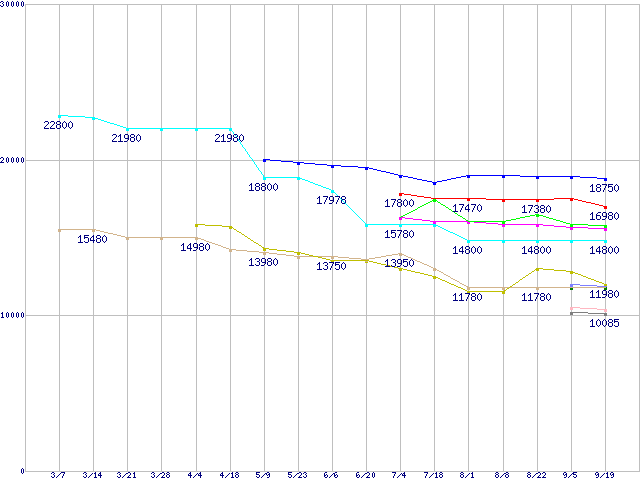 CPU主要製品(最安値1万円〜2万円未満)の最安値推移↑前グラフ↓次グラフ(2012年3月7日〜2012年9月19日)※このグラフは過去のデータも税率5%相当に調整した税込み相当額のグラフです。凡例Core i5-3570K (3.40GHz,HD 4000,TDP 77W)Core i5-3570 (3.40GHz,TDP 77W)Core i5-3470S (2.90GHz,TDP 65W)Core i5-3470 (3.20GHz,TDP 77W)FX-8150 (3.6GHz,L2 8MB,L3 8MB,TDP 125W)FX-6200 (3.8GHz,L2 6MB,L3 8MB,TDP 125W)Core i3-3240 (3.4GHz,TDP 55W)FX-8120 (3.1GHz,L2 8MB,L3 8MB,TDP 125W)Core i3-3225 (3.3GHz,HD 4000,TDP 55W)Core i3-3220T (2.8GHz,TDP 35W)Core i3-3220 (3.3GHz,TDP 55W)※製品名をクリックすると個別のグラフを表示します※点線部は販売店が確認できなかった、または調査データがないことを示します