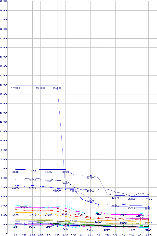HDD/SSD主要製品の最安値推移↑前グラフ↓次グラフ(2012年3月8日〜2012年9月20日)※このグラフは過去のデータも税率5%相当に調整した税込み相当額のグラフです。凡例MZ-7PC512 (512GB,MLC)SSD 520 (480GB,MLC)m4 (512GB,MLC)その他6Gbps対応SSD (480〜512GB,MLC)0S03357(純正パッケージ品) (4TB,64MB)PX-256M5P (256GB,MLC)SSD 520 (240GB,MLC)PX-256M5S (256GB,MLC)WD20NPVT (2TB,8MB,15mm厚)MZ-7PC256 (256GB,MLC)SSD 330 (240GB,MLC)m4 (256GB,MLC)0S03088(純正パッケージ品) (3TB,64MB)その他6Gbps対応SSD (240〜256GB,MLC)DT01ACA300 (3TB,64MB)PX-128M5P (128GB,MLC)SSD 520 (120GB,MLC)ST3000DM001 (3TB,64MB)WD30EZRX (3TB,64MB)PX-128M5S (128GB,MLC)0S03224(純正パッケージ品) (2TB,32MB)DT01ACA200 (2TB,64MB)0S03509 (1TB,8MB)SSD 330 (120GB,MLC)WD20EZRX (2TB,64MB)MZ-7PC128 (128GB,MLC)ST2000DM001 (2TB,64MB)WD20EARX (2TB,64MB)WD10JPVT (1TB,8MB)m4 (128GB,MLC)HN-M101MBB (1TB,8MB)MQ01ABD100 (1TB,8MB)その他6Gbps対応SSD (120〜128GB,MLC)※製品名をクリックすると個別のグラフを表示します※点線部は販売店が確認できなかった、または調査データがないことを示します