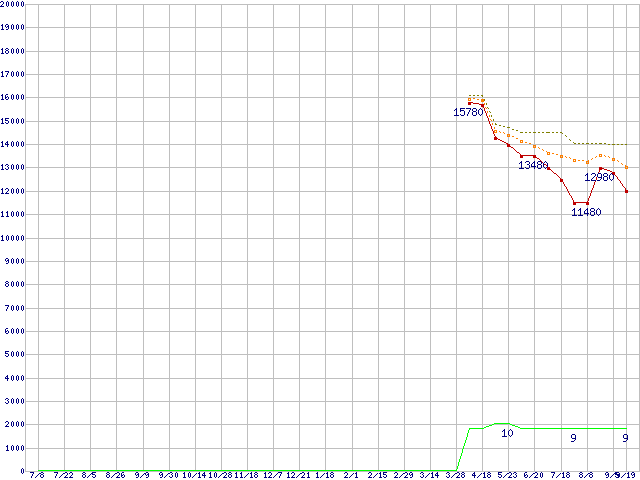 FX-6200 (3.8GHz,L2 6MB,L3 8MB,TDP 125W)の価格推移↑前グラフ↓次グラフ(2011年7月8日〜2012年9月19日)※このグラフは過去のデータも税率5%相当に調整した税込み相当額のグラフです。●関連グラフCPU主要製品の最安値推移CPU主要製品(最安値1万円〜2万円未満)の最安値推移AMD系CPUの最安値推移Socket AM3+ (HyperTransport,6Core)の最安値推移●凡例最安値(点線部は販売店未確認または未調査)平均値最高値ショップ数